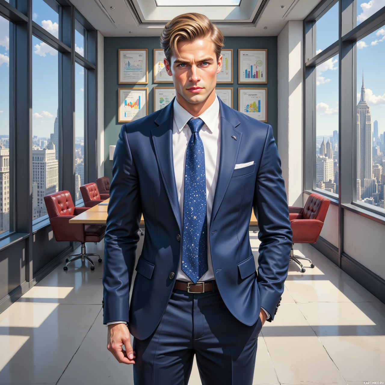 На картинке запечатлён молодой человек, стоящий в офисном помещении. На нём тёмно-синий костюм с галстуком в геометрический узор. Он смотрит прямо в камеру с нейтральным выражением лица. За его спиной – большие окна, из которых виден горизонт Нью-Йорка, что говорит о том, что фотография сделана в здании в Манхэттене. В интерьере – современная мебель и несколько картин в рамках, создающих ощущение профессиональной обстановки.