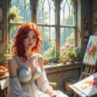 На картинке молодая женщина с яркими красными волосами сидит за старинным деревянным столом в помещении, которое, похоже, переоборудовали в рабочее пространство. В комнате царит атмосфера старины, что проявляется в облупившихся обоях и фотографиях в рамках, украшающих стены. На столе перед ней – красочная палитра и кисти, что говорит о том, что она, возможно, художник; небольшой букет цветов в вазах, добавляющий нотку природы в интерьер; и несколько личных вещей, которые сложно рассмотреть. Окно, занавешенное белыми шторами, пропускает естественный свет, а за ее головой видна одна стеклянная панель. На ней – легкая блузка с кружевными деталями, что придает ей элегантность и изысканность. Взгляд направлен в сторону от камеры, а выражение лица серьезное или задумчивое. Общая атмосфера картинки – тихий момент размышления или творчества в этой очаровательно оформленной комнате.