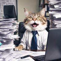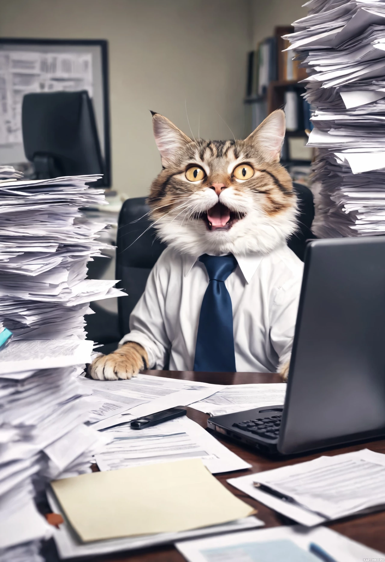 a humorous scene with an anthropomorphized cat wearing a suit and tie, sitting at a desk as if working. The cat is surrounded by