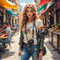 The image features a person standing on a street with shops and outdoor seating areas along the side. The individual appears to be holding a camera in their right hand, suggesting they might be taking photographs. They are wearing a casual ensemble that includes jeans, a graphic t-shirt, a jacket, and have long blonde hair. The setting looks like a sunny day with blue skies. The street is lined with buildings and storefronts displaying various items, such as fruits and decorative objects. The person is looking directly at the camera, giving a sense of engagement with the viewer.