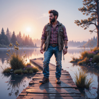 На картинке мужчина стоит на деревянном мостке, ведущем к водоему. Он смотрит вдаль, к горизонту, где солнце либо встаёт, либо садится, окрашивая небо в тёплые золотистые тона. У мужчины есть борода, он одет в жилет поверх рубашки с длинными рукавами, джинсы и коричневые ботинки. В сцене царит спокойная атмосфера, возможно, это сельская местность, окружённая хвойными деревьями. Общее впечатление – одиночество и размышления в ранние утренние или поздние вечерние часы, судя по освещению.