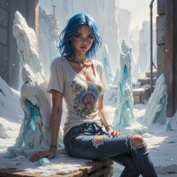 The image depicts a young woman with blue hair sitting on an icy surface, surrounded by snow-covered rocks and ice formations that resemble a frozen landscape. She is wearing a casual outfit consisting of a white t-shirt adorned with floral patterns at the neckline and jeans that appear to have distressed elements like ripped holes and frayed edges. Her pose suggests a sense of calm or contemplation. The color palette is predominantly cool, with shades of blue, white, and gray dominating the scene, reflecting the icy environment.