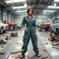 In the image, a young woman dressed in an olive green mechanic's jumpsuit stands confidently with her hands on her hips. She is positioned in front of a large garage filled with various classic cars. The garage has a high ceiling and industrial lighting. Among the collection of vehicles, a red MGB roadster, a Ford Mustang, and a Volkswagen Beetle are noticeable. The woman's stance suggests she is knowledgeable about these vehicles or her surroundings.