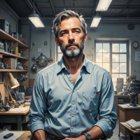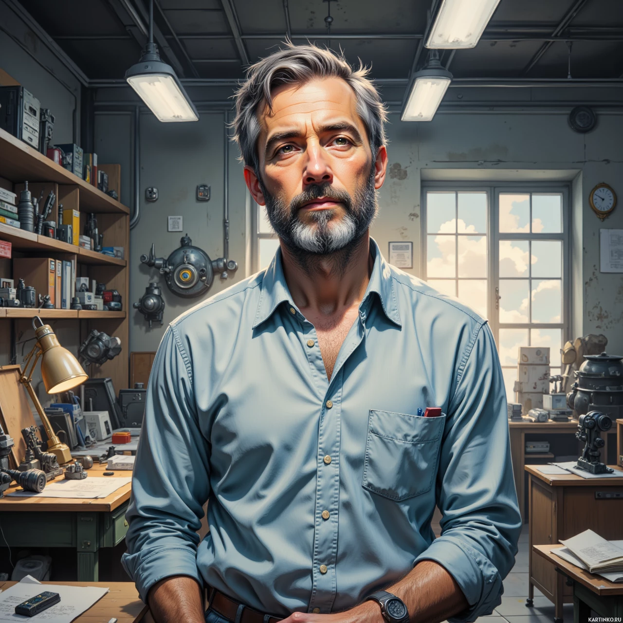 На картинке изображен мужчина, стоящий в помещении, похожем на мастерскую или лабораторию. Его окружают различные инструменты и оборудование. У мужчины борода, на нем голубая рубашка с подвернутыми рукавами, руки засунуты в карманы. Он смотрит прямо в камеру с серьезным выражением лица. В помещении видны стеллажи, заполненные книгами, приборами и, возможно, моделями самолетов или кораблей, а также окна, через которые проникает естественный свет.