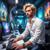 The image depicts a young man seated at a desk in what appears to be a modern, well-equipped office or gaming room. He is wearing a sleeveless top and has short hair. His facial expression is focused, as if he is working or playing on one of the multiple computer monitors that are positioned around him. The monitors display various colorful graphics that could be related to video games or digital artwork. On the desk in front of him, there's a keyboard and a mouse. The room has an industrial feel with concrete flooring and exposed ductwork on the ceiling.