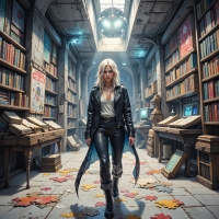 The image shows a woman with short white hair standing in an interior space that resembles a library or study room. She is wearing a black leather jacket, blue jeans, and boots. Her right hand is holding what appears to be a pair of binoculars or a similar device. Around her are shelves filled with books and various equipment, suggesting a setting that might be used for research or investigation. The lighting in the room is dim with a focus on her figure, giving the impression that she is the main subject of the image.