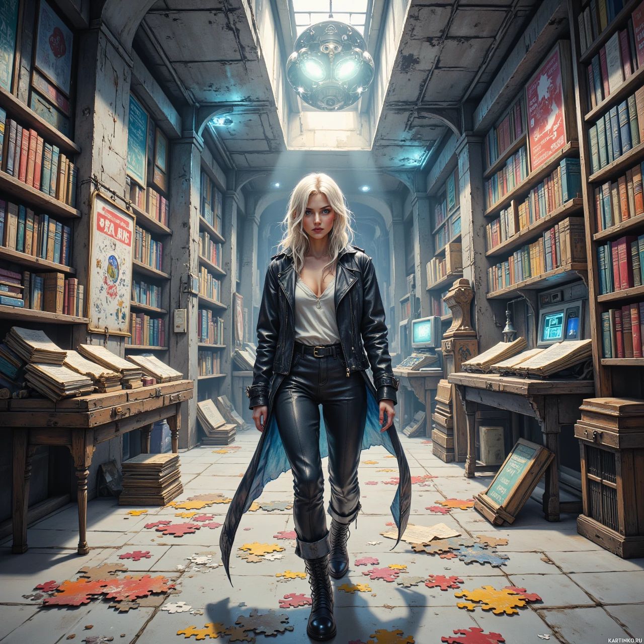 На картинке изображена женщина с короткой седой прической, стоящая в помещении, напоминающем библиотеку или кабинет. На ней черная кожаная куртка, джинсы и ботинки. В правой руке она держит что-то вроде бинокля или подобного прибора. Вокруг – полки с книгами и различным оборудованием, создающие атмосферу места, где могут проводиться исследования или расследования. Освещение в комнате приглушенное, акцент сделан на ее фигуре, что подчеркивает ее как главный объект на картинке.