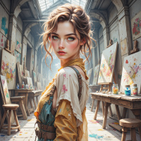 На картинке запечатлена молодая женщина со светлой кожей и светлыми волосами, уложенными в легкие волны, ниспадающие на плечи. У нее аккуратные брови, темные тени для век и яркая розовая помада. Выражение лица нейтральное, с легким наклоном головы. Она одета в художественный наряд: кремовая блуза с вышитыми цветами на груди и персиковый фартук с выцветшим рисунком и, кажется, разводами краски. Взгляд устремлен в сторону, избегая прямого контакта со зрителем. На заднем плане – художественная мастерская с множеством мольбертов, на которых выставлены различные работы разных стилей и размеров. Атмосфера располагает к себе: это хорошо освещенное пространство, которое может быть как рабочим местом художника, так и галереей. Свет создает мягкие тени на полу, подчеркивая умиротворенную обстановку. Стиль картины – реализм, с тщательной проработкой текстур и материалов, таких как холст, кисти и различные художественные принадлежности, разбросанные по всему пространству.