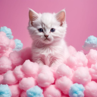 blue eyes and a white coat. The kitten appears to be sitting or lying down amongst several soft, pastel-colored balls. These balls could possibly be used for play or training purposes. The background is plain and does not distract from the main subject of the photo, which is clearly the kitten itself.