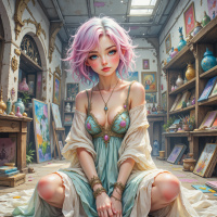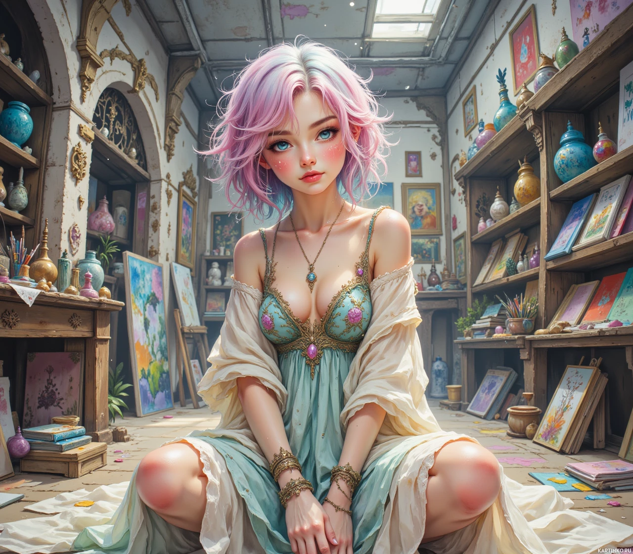 In this artwork depicting a girl with pink hair wearing an ornate dress, she is sitting on the floor of a room that resembles a treasure trove or a magical studio. The walls are adorned with paintings and framed pictures, and there are shelves filled with various artifacts and objects. The girl appears to be in deep thought or perhaps waiting for something, given her contemplative expression. The room has a fantastical feel, enhanced by the magical elements and the ethereal lighting that seems to fill the space.