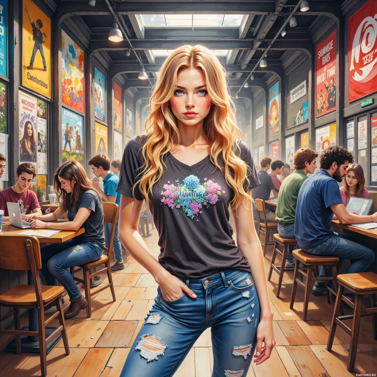 На картинке молодая женщина с длинными светлыми волосами стоит в комнате, стены которой увешаны плакатами. На ней черная футболка с графическим принтом и синие джинсы. Она стоит непринужденно, руки свободно заправлены в карманы. Взгляд направлен прямо в камеру, что создает впечатление уверенности и спокойствия.