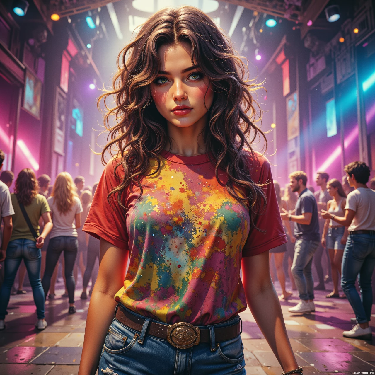 На картинке запечатлена молодая женщина, стоящая в, вероятно, переполненной комнате с приглушенным освещением, возможно, музыкальном клубе или ночном клубе. У нее длинные волнистые темные волосы, и она смотрит прямо в камеру с невозмутимым выражением лица. На ней яркая футболка в технике тай-дай с цветочным принтом и джинсы. Одежда указывает на непринужденный стиль, характерный для современной молодежной культуры. На заднем плане много других людей, занятых разными делами, что создает оживленную атмосферу.