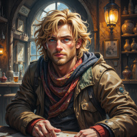 The image features a man seated at a table with various bottles and vials around him, suggesting a setting that could be an alchemist's workshop or tavern. He has long blond hair and is wearing a brown coat with a scarf draped over his shoulders. His expression appears contemplative as he looks off to the side with a concerned or thoughtful expression. The man is positioned in the center of the frame, and there are windows showing snowy scenes outside, indicating that it might be wintertime. The lighting suggests an indoor setting with candlelight contributing to the warmth of the scene.