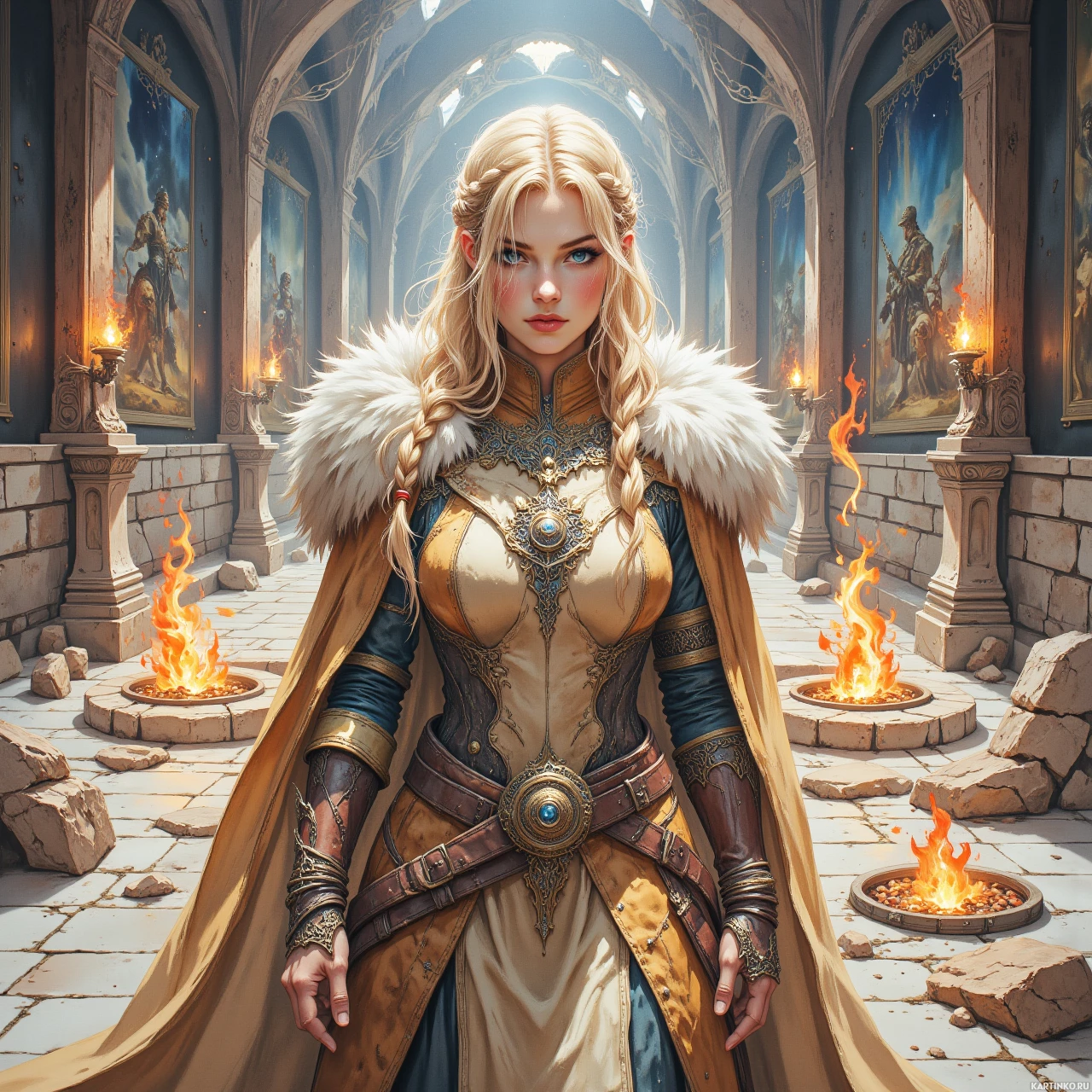 На картинке молодая женщина с длинными светлыми волосами стоит в помещении, которое излучает атмосферу старины, возможно, средневековья. В комнате высокий сводчатый потолок и каменные стены, украшенные гобеленами с изображением баталий и рыцарей. На полу горят факелы, дарящие теплую подсветку. На женщине средневековый наряд: бежевое пальто с меховой подкладкой, накинутое на плечи, и золотое ожерелье с замысловатым кулоном. Ее взгляд направлен в камеру, а выражение лица спокойное, но настороженное.