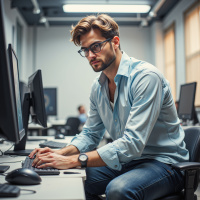 На картинке – мужчина сидит за столом с несколькими компьютерными мониторами. На нем очки, аккуратно подстриженная прическа. Одет он в расстегнутую рубашку, под которой видна майка, а на лице – спокойное выражение.