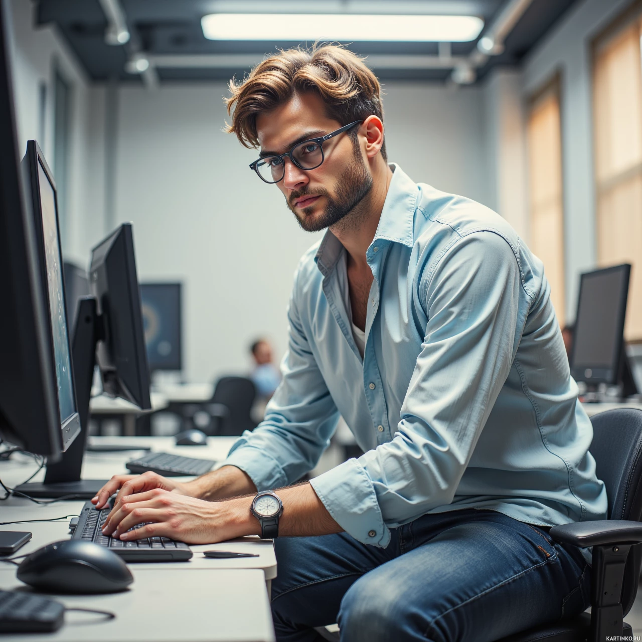 очки | Glasses | Красивый мужчина в очках за компьютерным столом