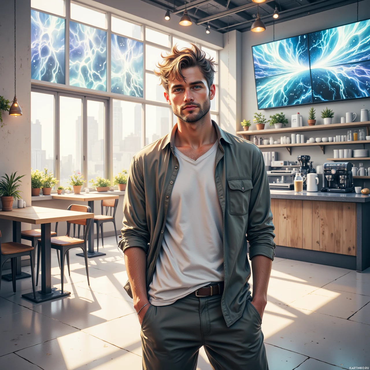 На картинке мужчина уверенно стоит на фоне городского пейзажа на закате. На нём белая рубашка, отлично сочетающаяся с оливковыми брюками. У него слегка растрепанные волосы, и на левом запястье часы, что добавляет ему стиля. Судя по всему, это открытое кафе или ресторан с высокими потолками и большими окнами, из которых открывается вид на город. На заднем плане видна барная стойка со стульями и различными бутылками и стаканами, аккуратно расставленными на полках. На стене за мужчиной изображены абстрактные молнии, возможно, символизирующие энергию или силу. Общая атмосфера картинки – современная и элегантная, с ноткой городской изюминки.