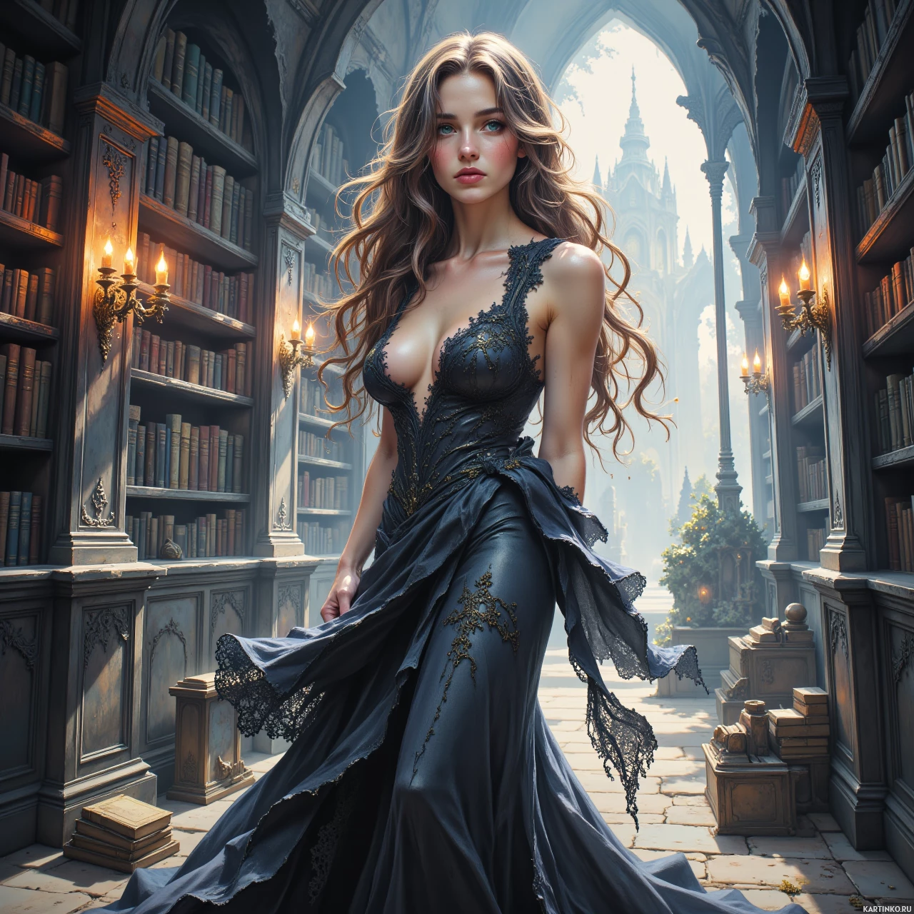 На картинке изображена девушка в роскошном платье в готическом стиле, которое изящно ниспадает, подчеркивая сложную кружевную отделку. У нее длинные, струящиеся волосы и макияж, усиливающий ее неземную красоту. Задний план – величественный зал или библиотека с высокими сводчатыми потолками и стеллажами, полными книг разных размеров и цветов. Мягкий свет от свечей освещает пространство, создавая теплую атмосферу. Девушка уверенно идет по центру картинки, что акцентирует ее ключевую роль в композиции.