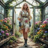 In the image, a woman with long blonde hair is seen walking through an archway in what appears to be a botanical garden or greenhouse. She's wearing a patterned dress that has floral designs and is accessorized with black boots and a wide belt cinching at her waist. The path she walks on is lined with vibrant potted plants in various shades of purple, blue, and orange, adding a splash of color to the scene. Above her head, the structure of the archway frames a clear sky, suggesting that it's daytime. The overall mood of the image is serene and picturesque.