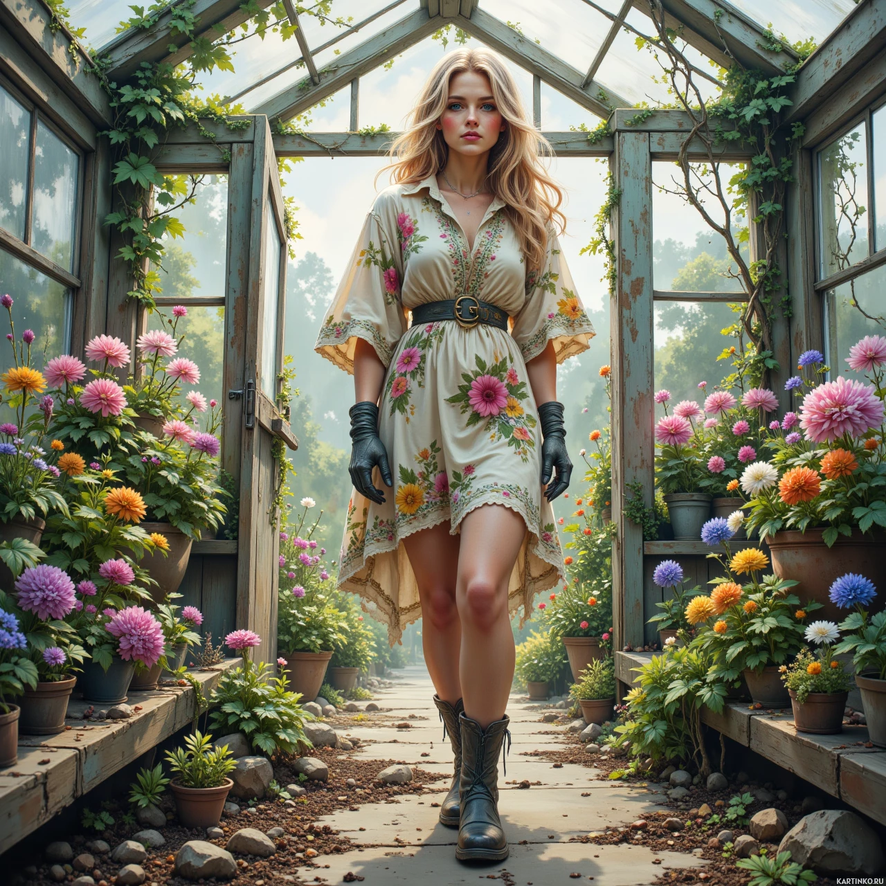 На картинке женщина с длинными светлыми волосами идет через арку в том, что похоже на ботанический сад или оранжерею. На ней платье с цветочным принтом, черные сапоги и широкий пояс, подчеркивающий талию. Тропинка, по которой она идет, выложена яркими в горшках растениями разных оттенков фиолетового, синего и оранжевого, добавляя красок в пейзаж. Над головой, свод арки обрамляет чистое небо, намекая на дневное время. Общее настроение картинки – спокойное и живописное.