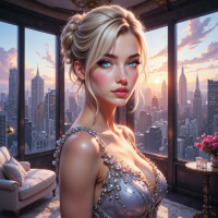 In this image, a young woman with blonde hair and blue eyes is standing in an opulent room at sunset overlooking the city skyline of New York. She is dressed in a shimmering silver dress that glimmers subtly under the soft light. Her gaze is directed off to the side with a gentle smile, suggesting a sense of serenity or admiration for the view. The room around her is elegantly furnished with luxurious items such as fine fabrics and classic decorations. The window offers a clear view of the city's iconic buildings, including the Empire State Building. The sky outside is awash with hues of pink and orange, indicating that it is either sunrise or sunset.
