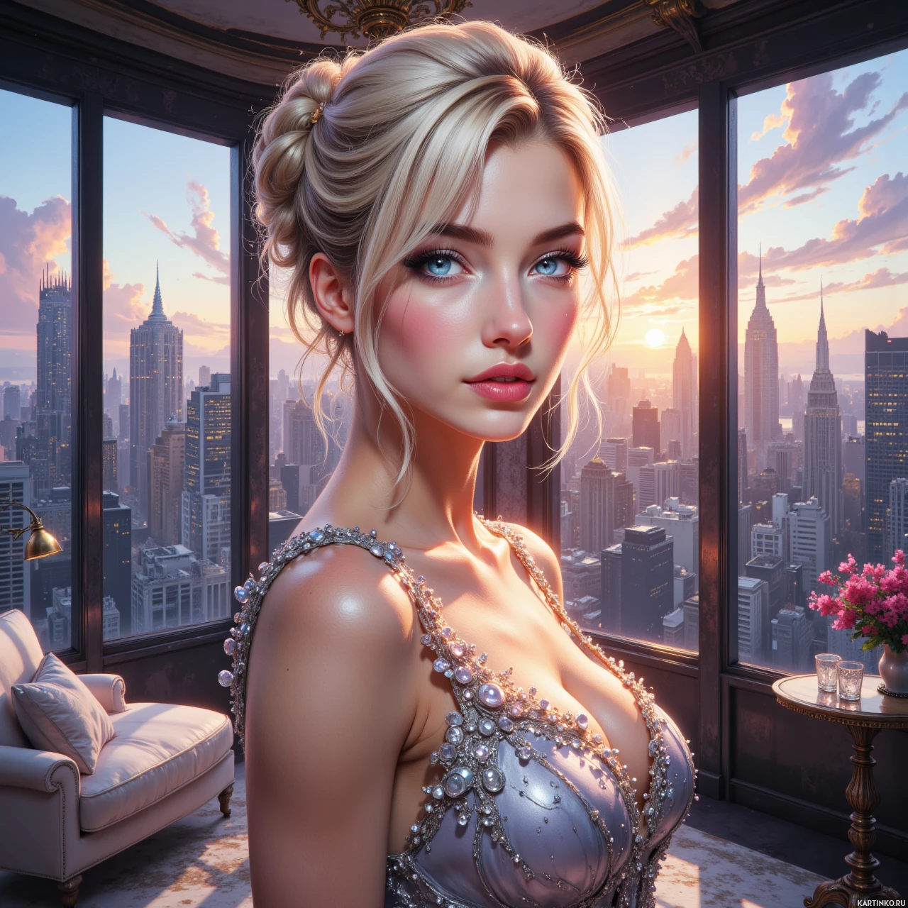 На картинке молодая женщина с золотистыми волосами и голубыми глазами стоит в роскошной комнате на закате, любуясь панорамой Нью-Йорка. На ней струящееся серебристое платье, которое мягко переливается в приглушенном свете. Ее взгляд направлен вдаль с легкой улыбкой, словно она испытывает спокойствие или восхищение открывающимся видом. Вокруг нее – элегантно обставленная комната с дорогими тканями и классическим декором. Окно открывает захватывающий вид на знаменитые здания города, в том числе Эмпайр-стейт-билдинг. Небо за окном окрашено в нежно-розовые и оранжевые оттенки.
