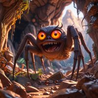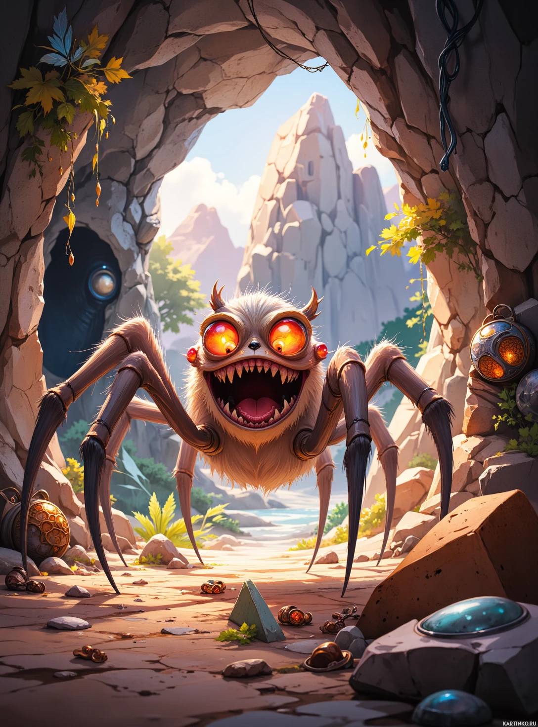 cave entrance, surrounded by rocks and greenery. It has eight legs like a spider but also features such as arms, hands, and