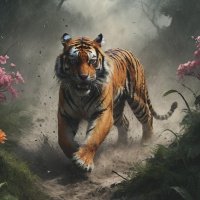 a majestic tiger walking on a path through a lush, forested area. The tiger is oriented towards the viewer and appears to be in motion, with its muscles visibly tense. The forest is dense with various types of trees, some of which are adorned with