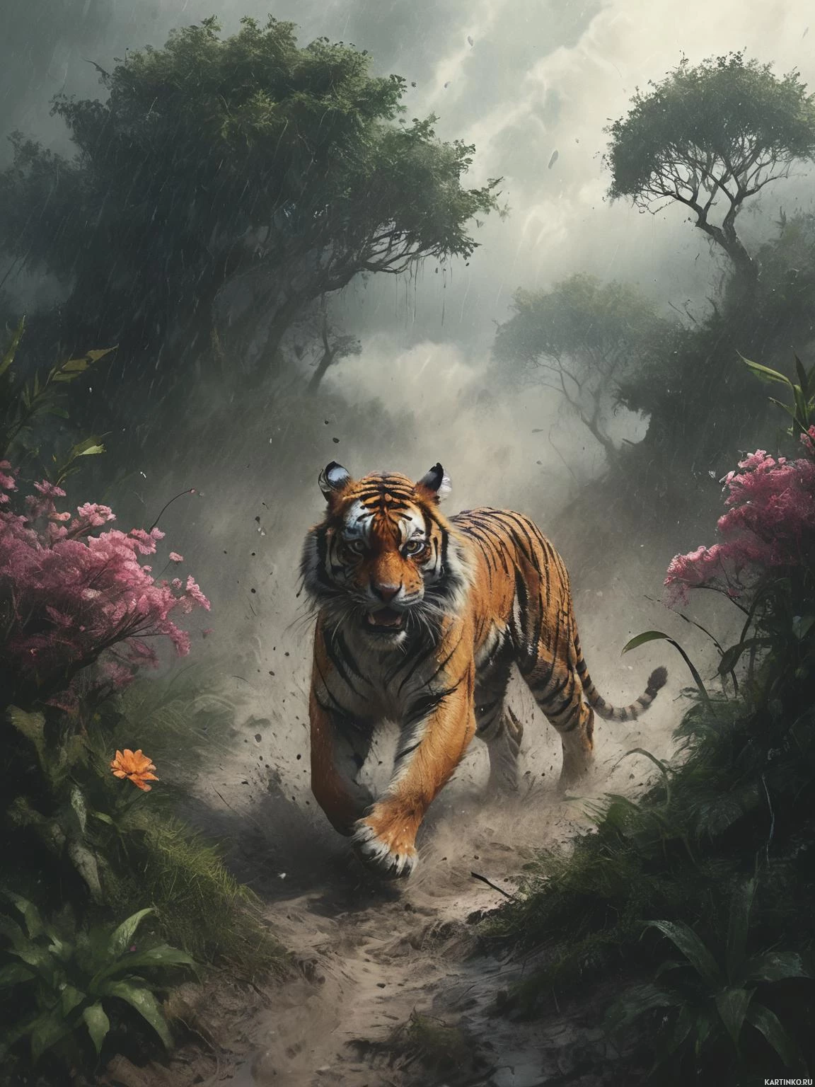 blooming flowers. There's an atmospheric quality to the scene, as the sky above suggests a storm or
