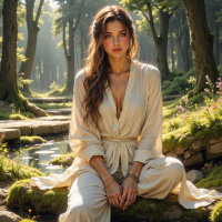 На картинке женщина сидит на камне у пруда, окружённого тихой лесной глушью. У неё длинные каштановые волосы, а на ней бежевый халат с завязкой на талии. Солнечный свет пробивается сквозь листву, создавая на её лице и одежде игривые блики.