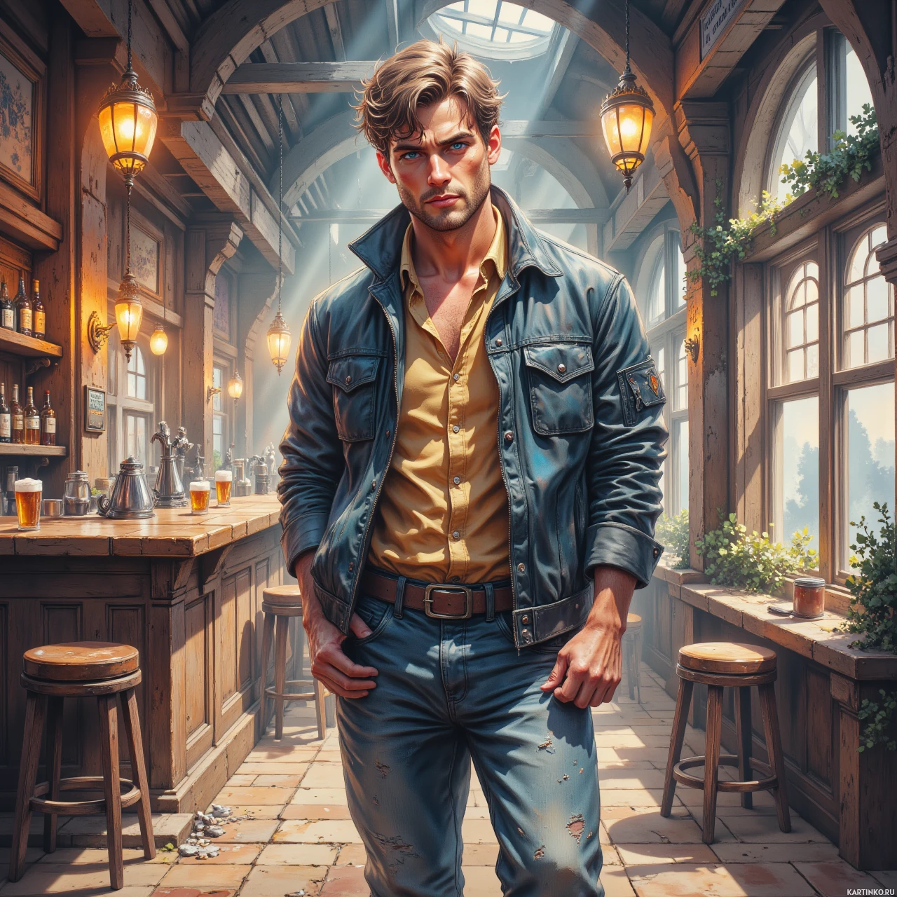 Картинка показывает мужского персонажа, стоящего в интерьере, напоминающем бар или таверну, оформленном в старомодном стиле: темные деревянные панели и металлические детали. В центре – мужчина в кожаной куртке поверх желтой футболки и джинсов. У него короткие, непослушные волосы, и он смотрит прямо на зрителя с серьезным выражением лица. Осанка говорит о уверенности в себе. Вокруг него – привычные элементы такого места: деревянная барная стойка с бутылками и стаканами, стулья и полки с разномастной бутылками на заднем плане. Освещение мягкое, похоже на естественный свет, исходящий из невидимых в кадре источников.