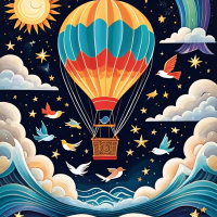 a fantastical scene with various elements that create a dreamlike atmosphere. At the center, there is a large hot air balloon with