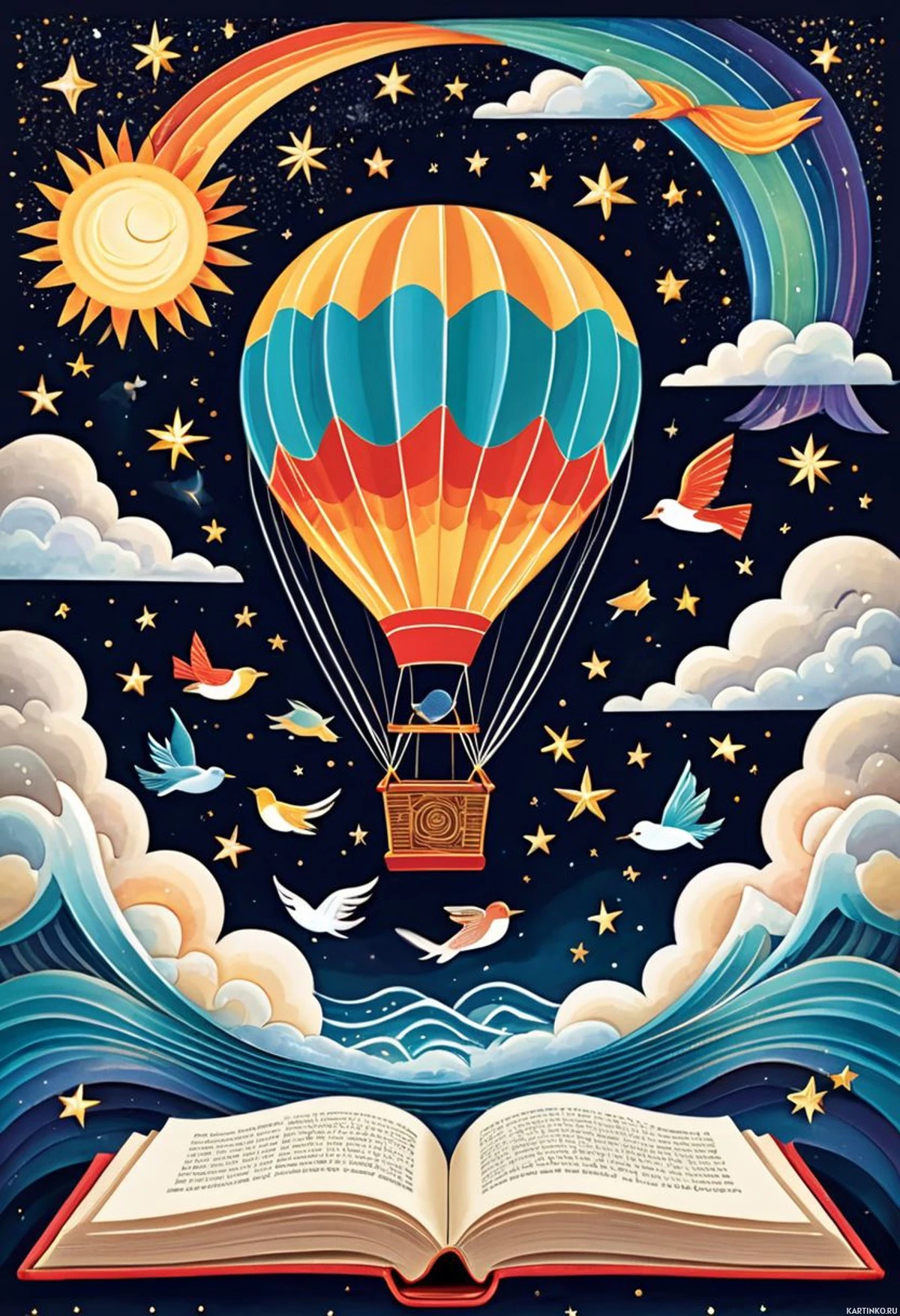 the power of stories or the vastness of knowledge. To the right, a bird with outstretched wings is flying above the book, which could represent freedom or the spread of ideas through storytelling. In the background, there are clouds and stars, adding to the ethereal quality of the scene. The colors are rich and varied, contributing to the overall whimsical and adventurous theme of the image.