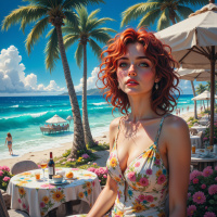 In the image, a woman with vibrant red hair and stylish glasses is seated at a table on a sunny beach. She's dressed in a floral dress that pops against the backdrop of palm trees. On the table in front of her, there are several items including a bottle, a cup, and an orange. The woman is looking towards the camera with a relaxed expression. In the background, other beachgoers can be seen enjoying their time under umbrellas on the sandy shore.