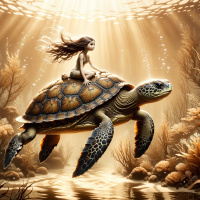 the center of the composition is a large, majestic tortoise with a yellowish shell, adorned with blue markings. On its back sits a young girl with