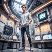 The image depicts a man standing in what appears to be a futuristic control room. He has short hair and is wearing a hooded sweatshirt, blue jeans, and sneakers. His gaze is directed off to the side, away from the viewer. The room features various screens displaying graphs and data, suggesting some form of monitoring or command center environment. The style of the image suggests it could be related to science fiction or a high-tech theme.