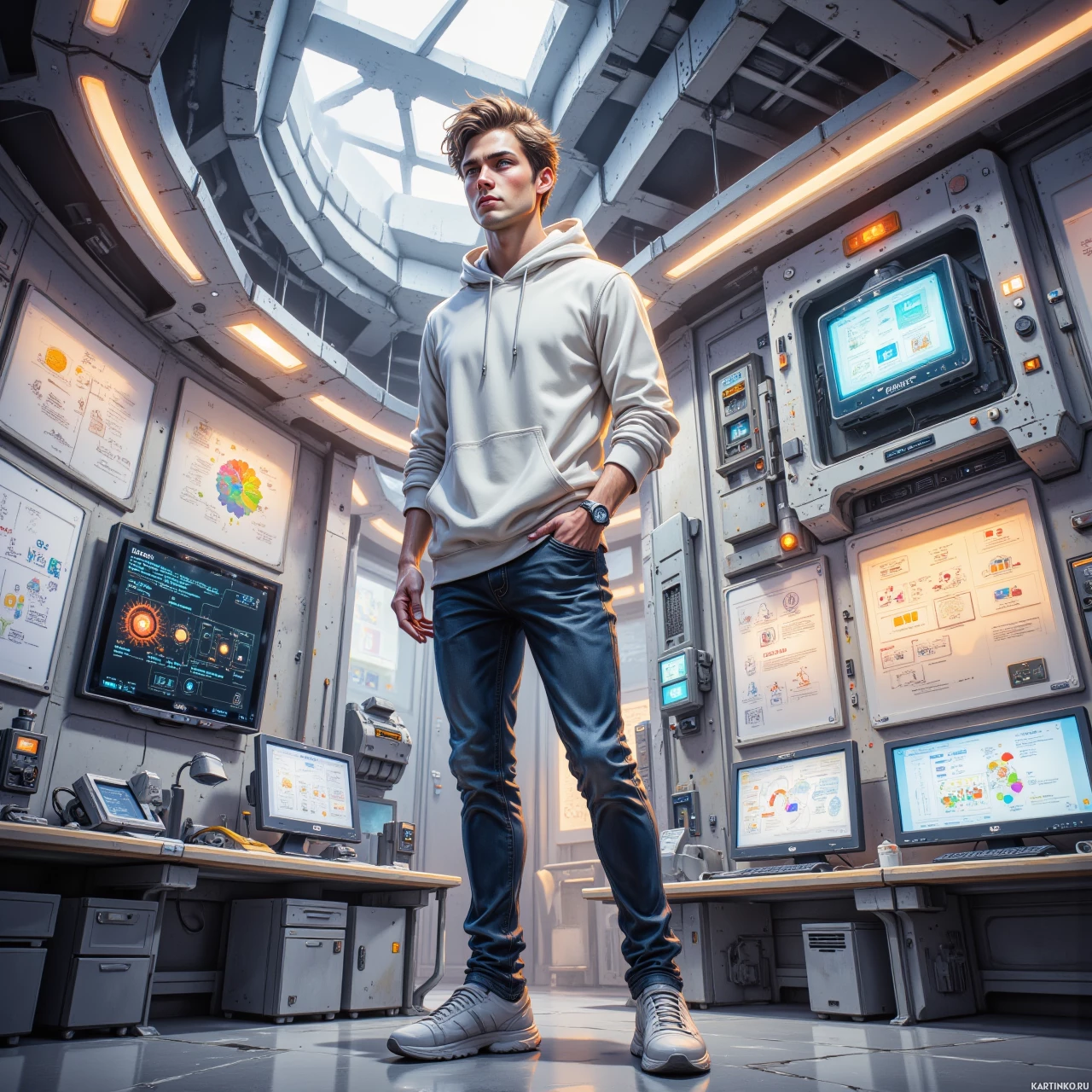 На картинке изображен мужчина, стоящий в помещении, похожем на футуристическую диспетчерскую. У него короткая стрижка, на нем толстовка с капюшоном, джинсы и кроссовки. Взгляд устремлен в сторону, не на зрителя. В комнате много экранов, на которых отображаются графики и данные, что указывает на среду мониторинга или командный центр. Стиль картинки намекает на связь с научной фантастикой или высокотехнологичной тематикой.