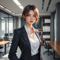 Картинка демонстрирует женщину в темном блейзере и светлой блузке, стоящую в офисе с современной мебелью и видом на город. У нее выделенные волосы и уверенное выражение лица.