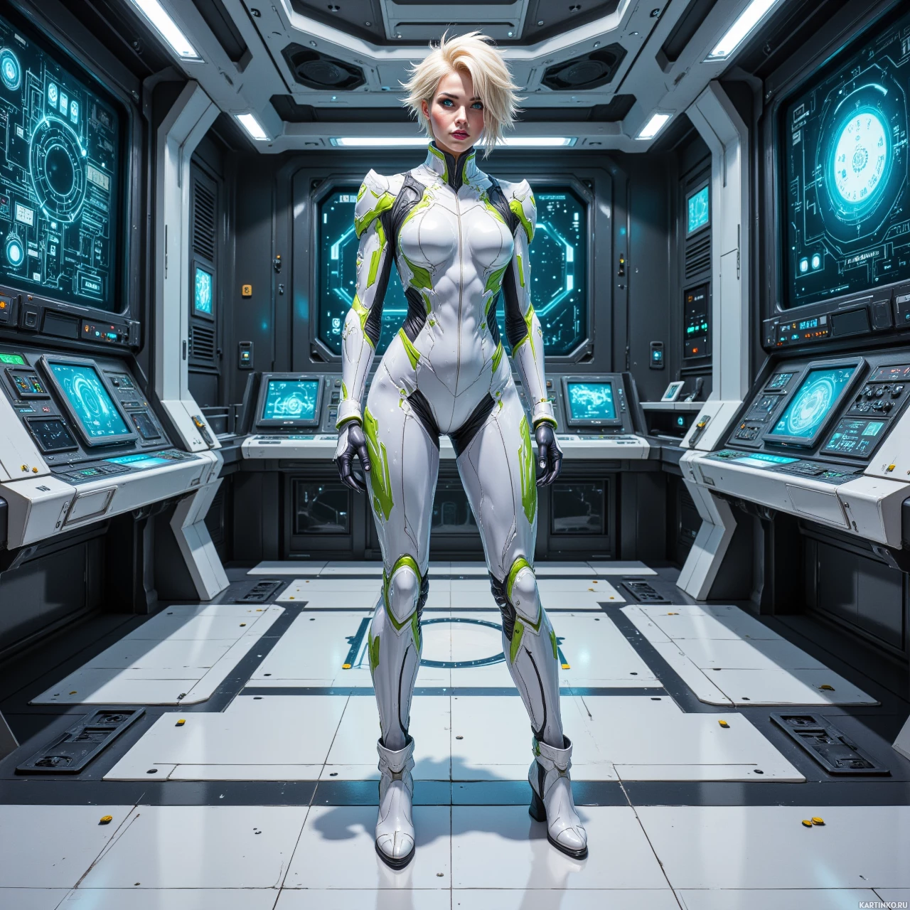 На картинке изображена девушка, стоящая в передовом технологичном окружении. У неё светлые волосы, и она одета в белый, зелёный и чёрный комбинезон со сложной вышивкой, что указывает на научно-фантастический контекст. Похоже, что костюм разработан для обеспечения гибкости и функциональности, необходимой для физической активности. В кадре – несколько панелей цифровых дисплеев с интерфейсами, напоминающими технические данные или панели управления. Экраны подсвечены оттенками синего и зелёного, создавая атмосферу высоких технологий. Пол покрыт сеткой, которая может быть частью конструкции помещения или служить направляющими для передвижения. Освещение на картинке яркое, и оно отражается от глянцевых поверхностей костюма и пола.