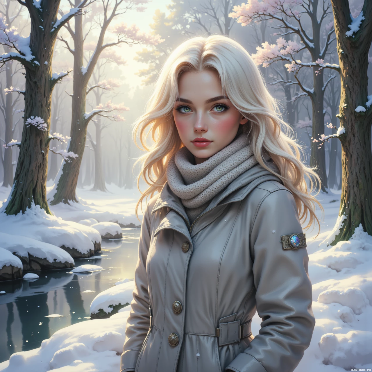 На картинке запечатлена молодая женщина с белыми волосами и светлой кожей. У нее выразительные голубые глаза. Ее выражение лица нейтральное, и она смотрит прямо на зрителя. На ней бежевое или светлое пальто и шарф, что говорит о холодной погоде. На заднем плане – заснеженные деревья, что указывает на зимнее время года. Снег на земле отражает солнечный свет, добавляя ощущение спокойствия и умиротворения.