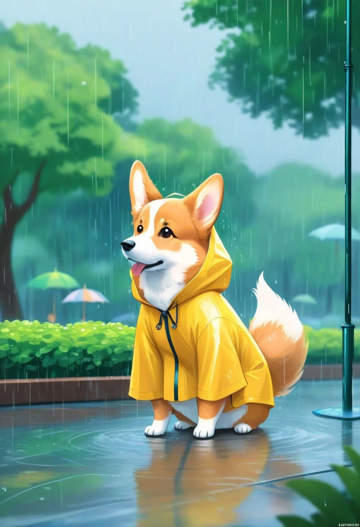 soaked pavement, wearing a yellow hooded raincoat. The dog has floppy ears and appears to be smiling or looking happy despite