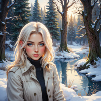 На картинке изображена юная девушка с белыми волосами и голубыми глазами в спокойной обстановке. Она расположена слева в кадре, её взгляд направлен вправо. На ней бежевая куртка поверх черного водолазка, что наводит на мысль о прохладной погоде или, возможно, любви к многослойному стилю. За ней простирается лес с высокими деревьями и заснеженной землей, что говорит о зиме или ранней весне. Солнечный свет пробивается сквозь кроны деревьев, отбрасывая длинные тени на снег.