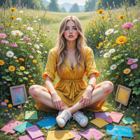 In this picture, a young woman with blonde hair is sitting on the grass in a field of wildflowers. She wears a yellow dress and has her legs crossed. On the ground around her are various colorful cards that she appears to be arranging or organizing. The background features lush greenery and more wildflowers, contributing to a serene and vibrant natural setting.