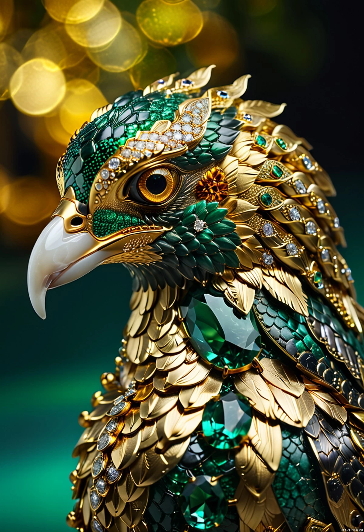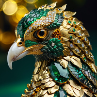 a majestic bird adorned with intricate decorations. It has vibrant green plumage and
