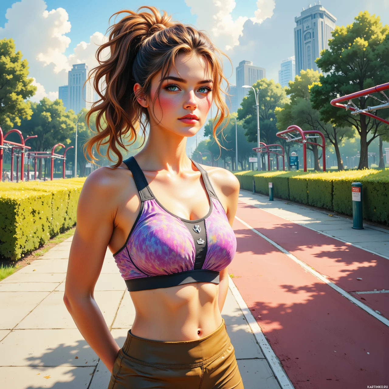 На картинке изображена девушка в стилизованном цифровом арте. У нее длинные волнистые волосы, собранные в пучок, она в фиолетовом спортивном бюстгальтере с черными вставками и коричневых шортах. Её поза расслабленная, но уверенная, и она смотрит прямо в камеру с нейтральным выражением лица. На заднем плане — вымощенная дорожка, обрамленная деревьями и скамейками, что указывает на обстановку городского парка.