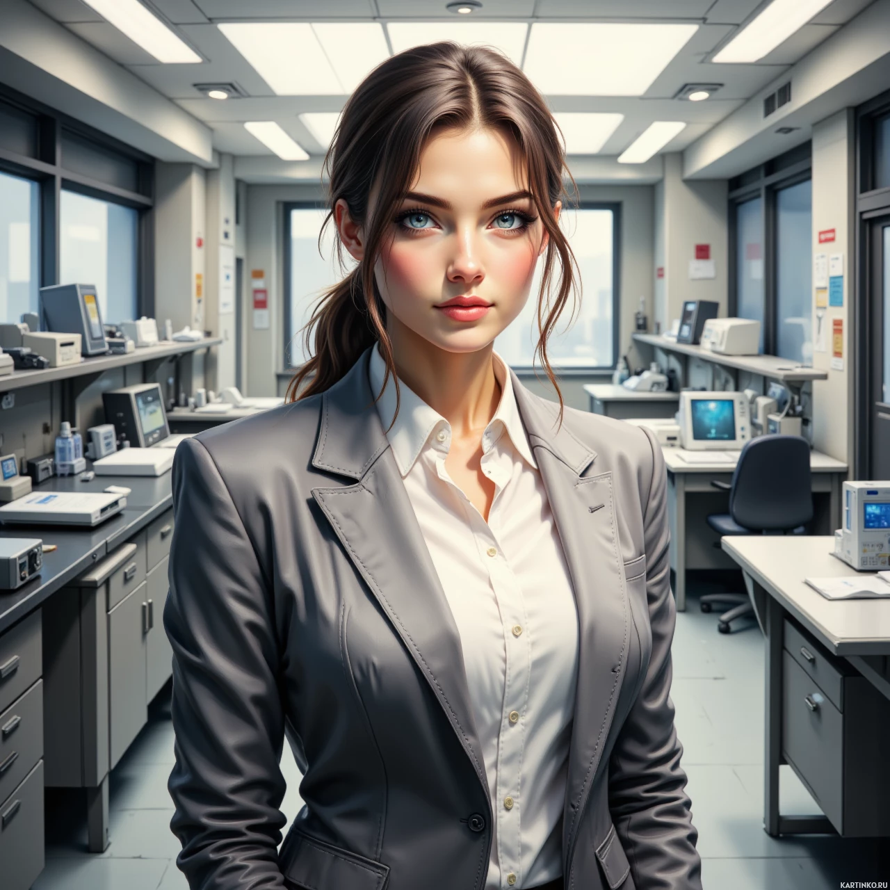 На картинке запечатлена молодая женщина, стоящая в помещении, напоминающем рубку управления, возможно, на борту самолета или космического корабля, судя по наличию консолей и экранов. На ней строгий серый костюм, волосы уложены. Выражение лица нейтральное, она смотрит прямо в камеру, слегка наклонив голову. На заднем плане видны панели с оборудованием, переключателями и, по всей видимости, приборными панелями.