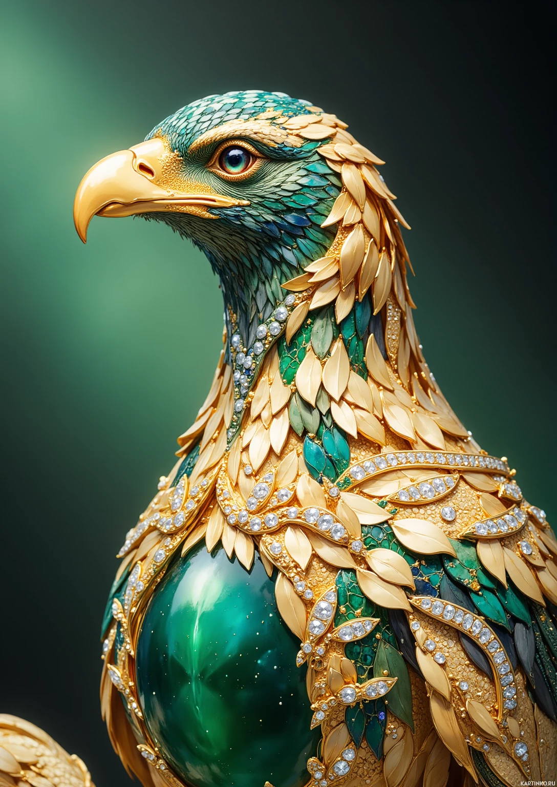green body, large eagle-like eyes, and is topped with a crest on its head. It wears a necklace of gold leafs and beads that shimmer around the neck area. Additionally, there are gemstones embedded into the body, likely representing feathers or scales. The background is muted in color, providing contrast to
