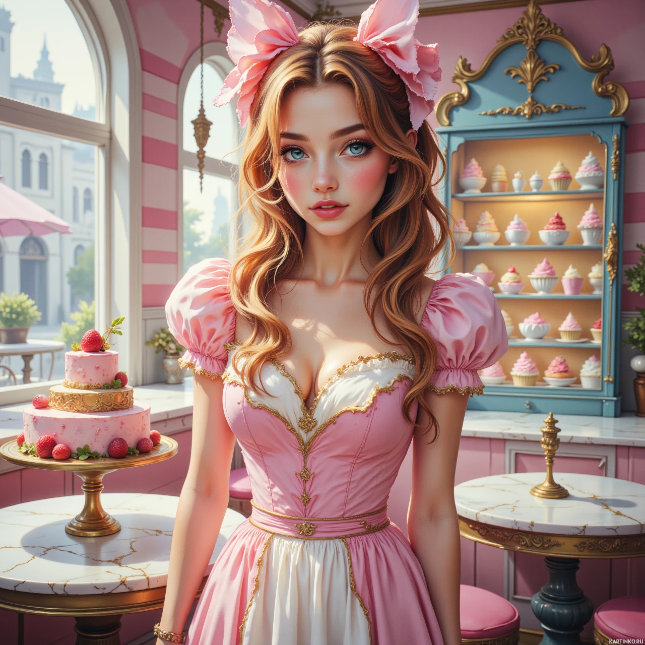 На картинке изображена женщина, стоящая в помещении, напоминающем кафе или кондитерскую в розовых тонах. На ней розовое платье с пышными рукавами и бантиком на талии, а также подходящая повязка с большим бантом сбоку. У женщины длинные кудрявые волосы и макияж с яркими голубыми тенями и розовой помадой. Позади нее окно, из которого видно парк с деревьями и зданиями. По обе стороны от женщины стоят столики, на которых разложены сладости: на одном – торты, на другом – подносы с чем-то, похожим на десерты со свежей клубникой. Общая атмосфера картинки – сказочная и полная фантазии.