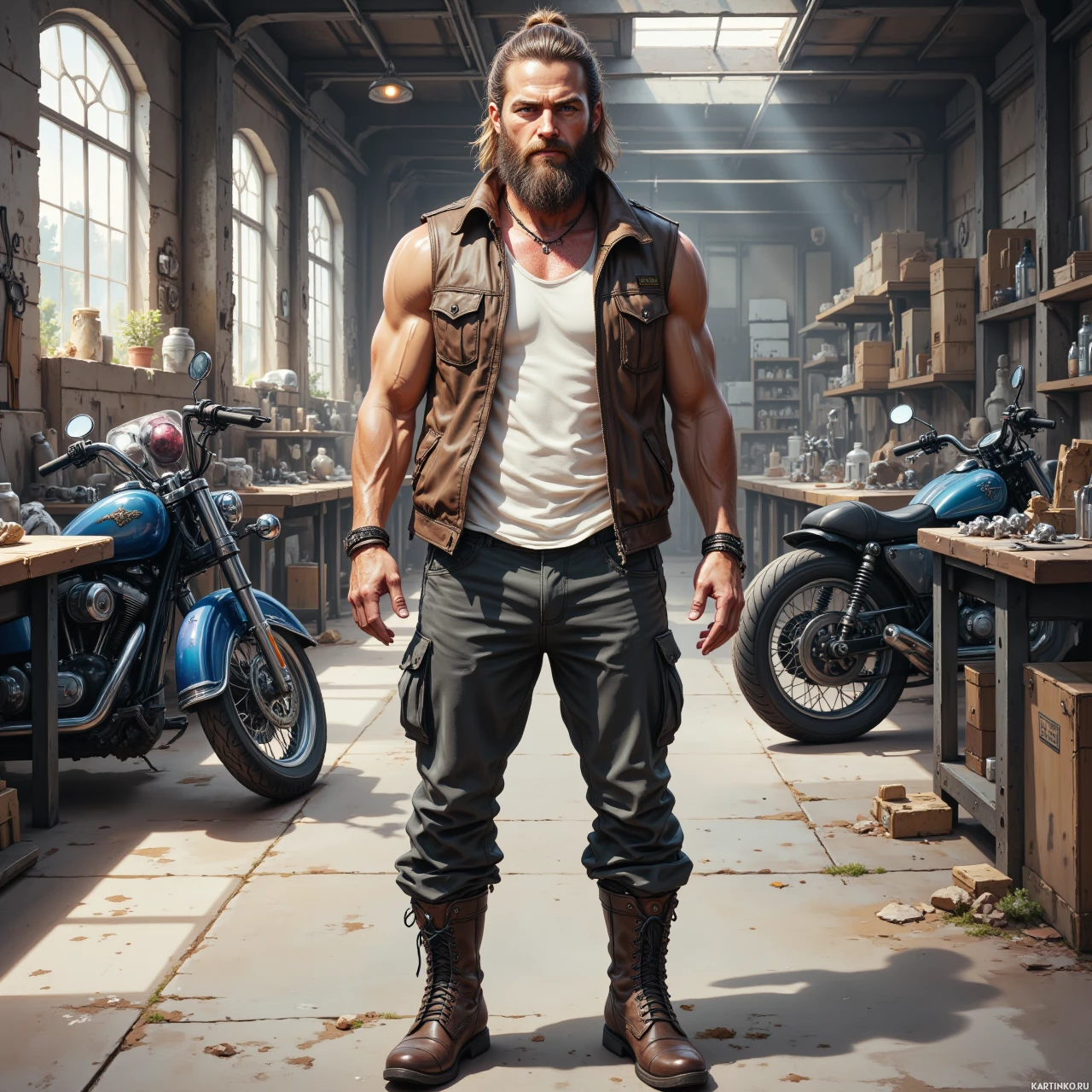 На картинке мужчина уверенно стоит в просторном помещении, заполненном мотоциклами. На нём коричневая кожаная куртка и брюки, а на ногах — высокие черные ботинки. Руки скрещены на груди, что придает ему вид человека, знающего себе цену. За его спиной на деревянных подставках стоят мотоциклы, чьи блестящие поверхности отражают свет в комнате. Мужчина расположен перед мотоциклами, что говорит о его связи или интересе к ним.