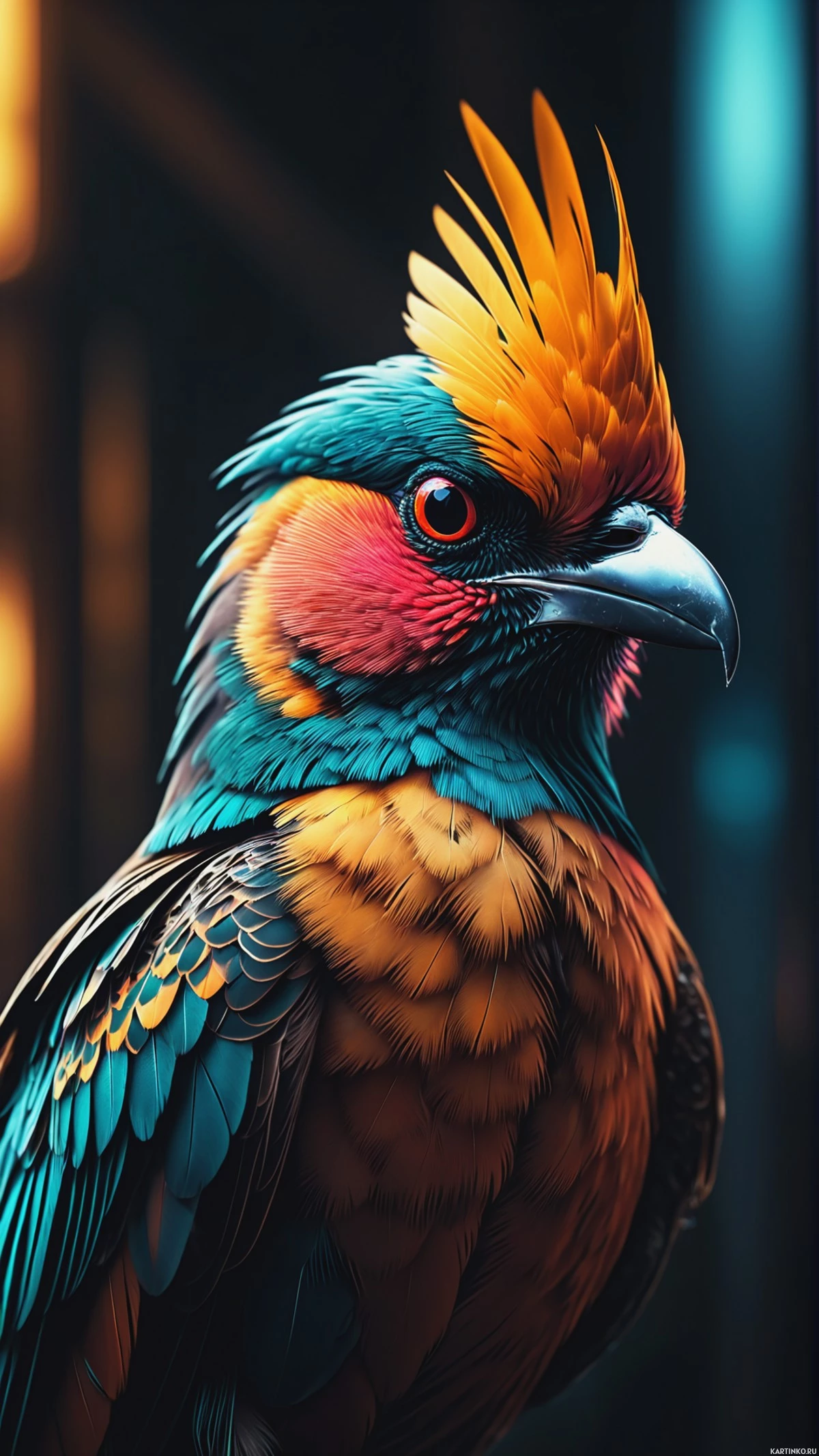 multi-colored bird with distinctive crest feathers on its head. The feathers are predominantly blue and yellow, with some red highlighting the head region. The bird appears to have